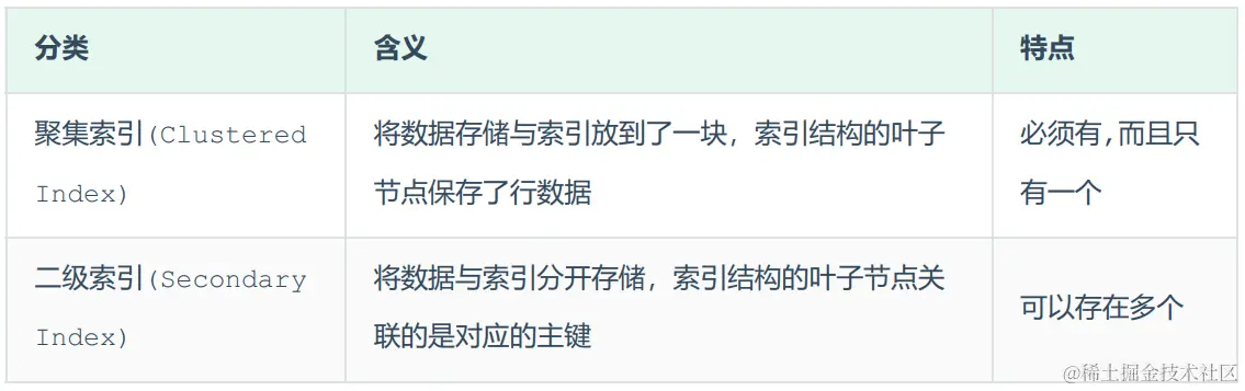 - 按「物理存储」分类:聚簇索引(主键索引)、二级索引(辅助索引) 。