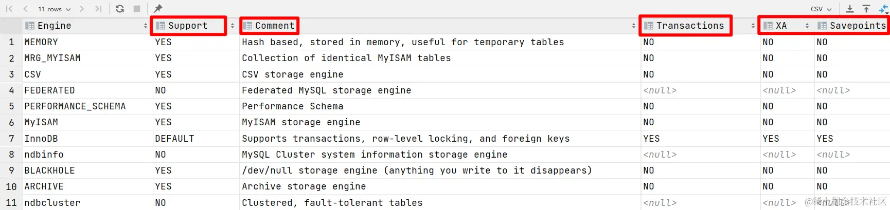 - Support列的值表示是否可以使用该引擎: “YES”、“NO”和“DEFAULT”表示该引擎存在、不可用或可用,当前设置为默认的存储引擎。