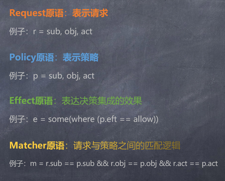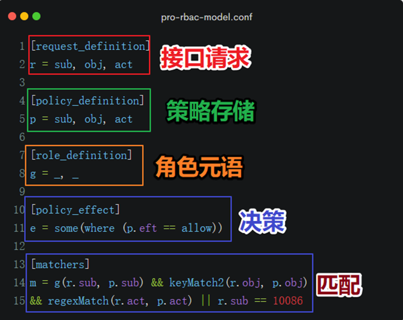 [request_definition]、[policy_definition]、[policy_effect]、[matchers] - 如果 model 使用 RBAC, 还需要添加