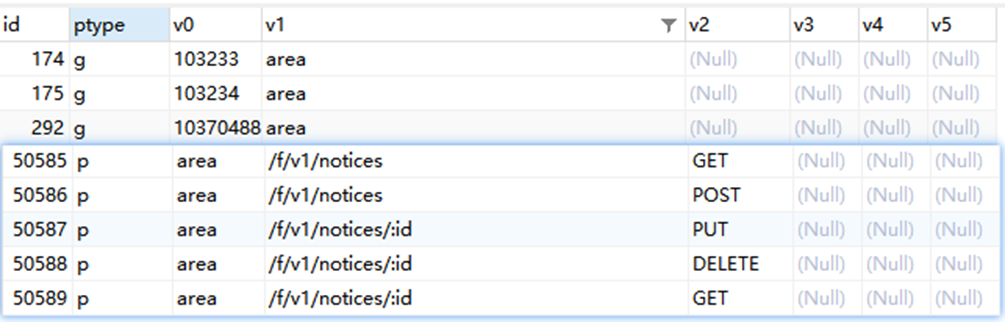 区县策略:以上针对区县 area 角色,定义了5条策略,分别是通知公告接口的列表、创建、修改、删除、详情。
