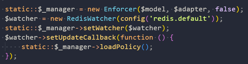 注意:在 PHP-FPM 环境下,并不需要Watcher,因为每个请求都是一个独立的fpm进程,都会实例化一个全新的Enforcer实例。