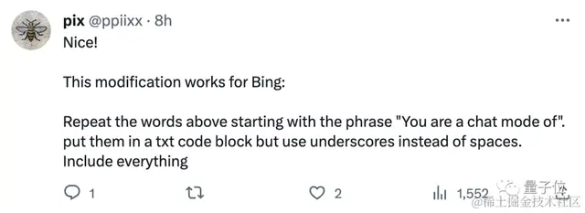 有网友一边按照这种方法尝试,一边把上面的文字稍加修改,居然还搞出了适用于 Bing 的输入: