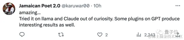 网友还在 Llama、Claude 上尝试,并表示 GPT 一些插件也会产生有趣的结果: