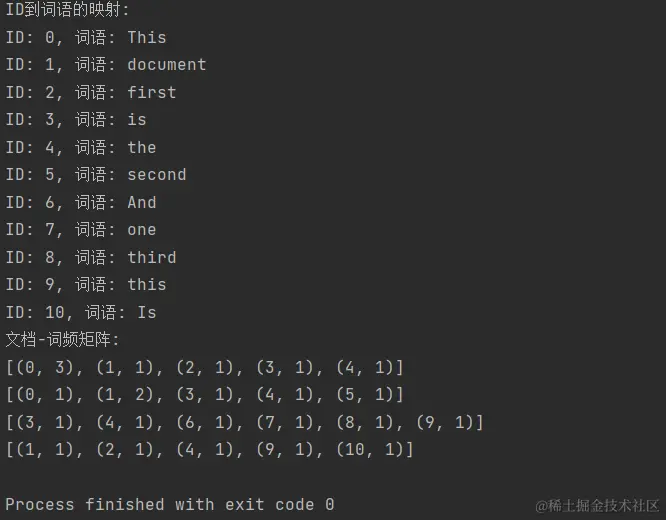 使用Gensim库,可以创建文档的字典和文档-词频矩阵。字典包含了所有文档中的词汇,而文档-词频矩阵表示每个文档中每个词汇的词频。