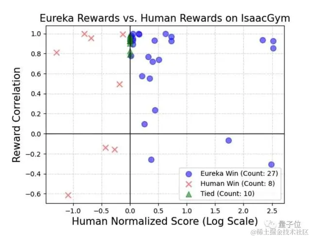 让研究人员惊讶的是,尤其在处理复杂、高维电机控制的任务上,Eureka 表现更好,且与人类奖励的相关性越低。