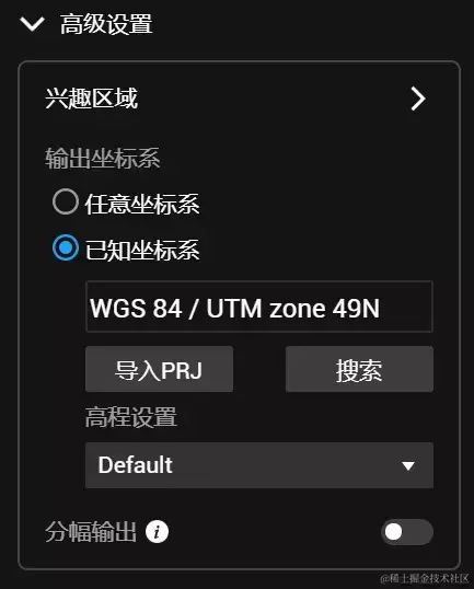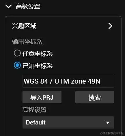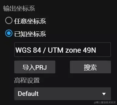 在二维地图和三维模型时,用户可在添加照片后,设置输出坐标系。若照片不包含 POS信息,则输出坐标系默认为 “任意坐标系”。若已添加的照片包含 POS 信息,二维地图默认设置为该任务所处的UTM投影坐标系。需要注意的是,如果刺了像控点,则输出坐标系一定要与像控点坐标系保持一致,否则会出现成果与像控点坐标匹配不上的情况。