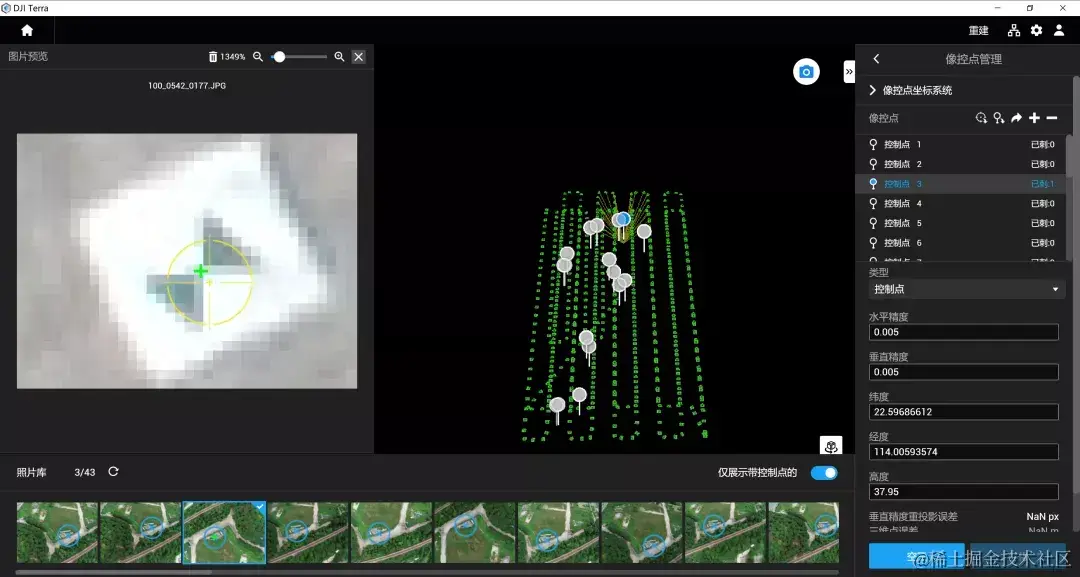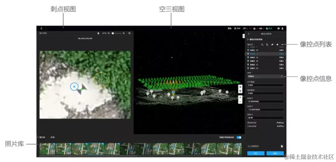 点击【像控点管理】进入像控点管理页面,页面主要包括像控点列表、像控点信息、照片库、空三视图、刺点视图。刺点视图在选择照片库中的影像后,将出现在空三视图左侧,如下图所示。可在此页面添加像控点、刺点,进行空三解算及优化。