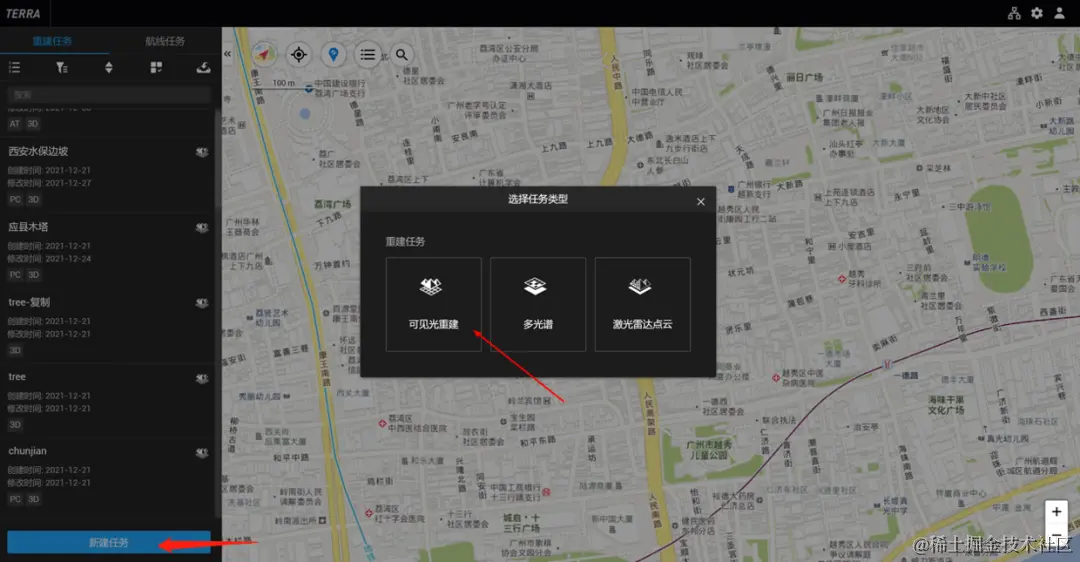 启动大疆智图软件并登录后,点击左下角新建任务,选择【可见光重建】任务类型。