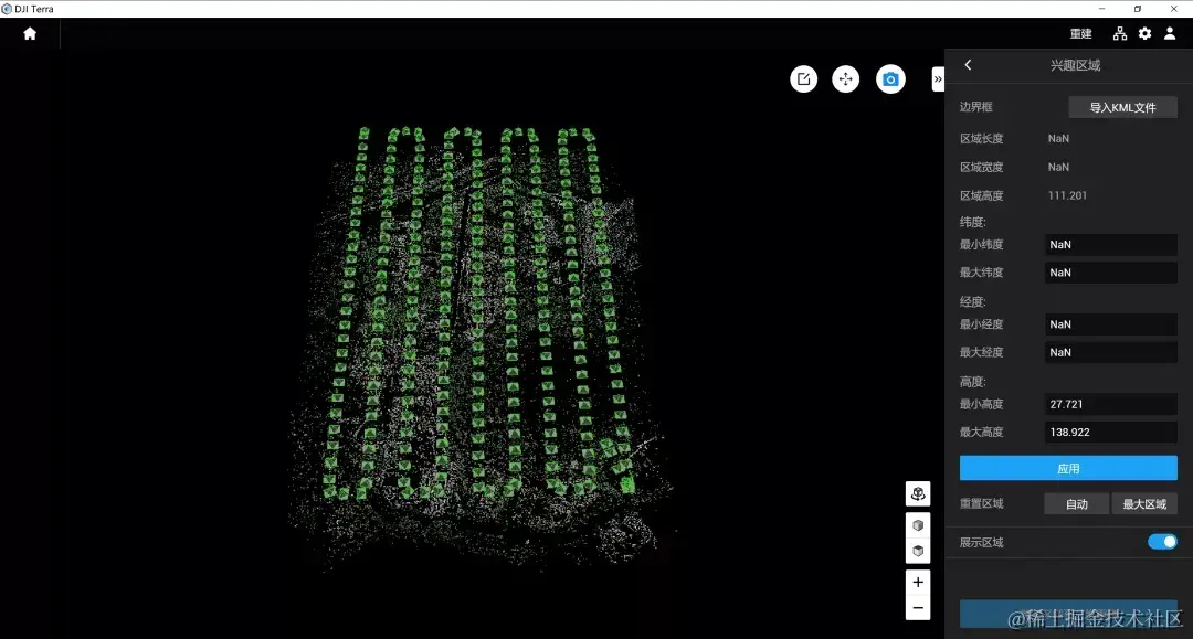 3.在“重置区域”的选项处,点击“自动”或“最大区域”,软件将自动生成兴趣区域。自动:按照空三点云分布,自动计算合适的长方体区域。最大区域:覆盖所有空三点云的长方体区域。