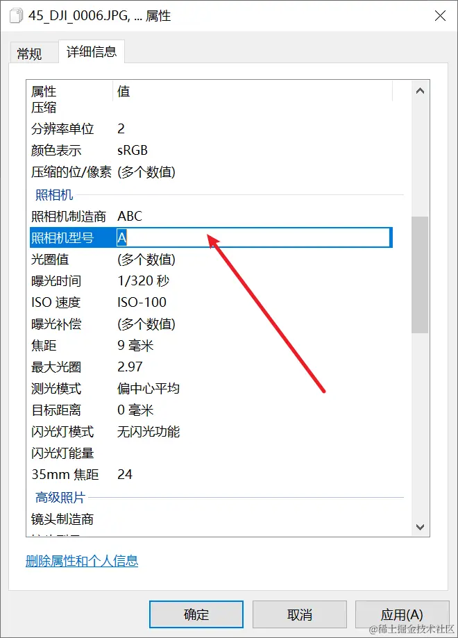 对于第三方设备未定义“35mm焦距”参数的影像,可定义该参数以提升重建效率和效果。将所有影像储存在一个文件夹下全选照片,右键点击“属性”,点击“详细信息”,下拉找到“35mm焦距”参数项,双击右侧参数值框进入编辑模式,输入正确的35mm等效焦距值。