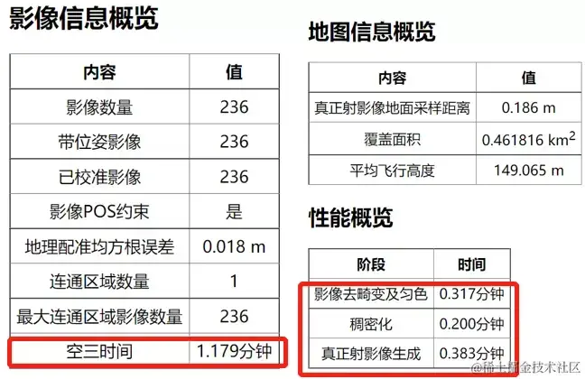 模型重建完成后,可点击【质量报告】查看整体情况,可从报告中查看成果分辨率、覆盖面积、重建时间等。需要注意的是,整个二维地图时间应该包括空三、影像去畸变及匀色、稠密化、真正射影像生成四个步骤的时间之和。