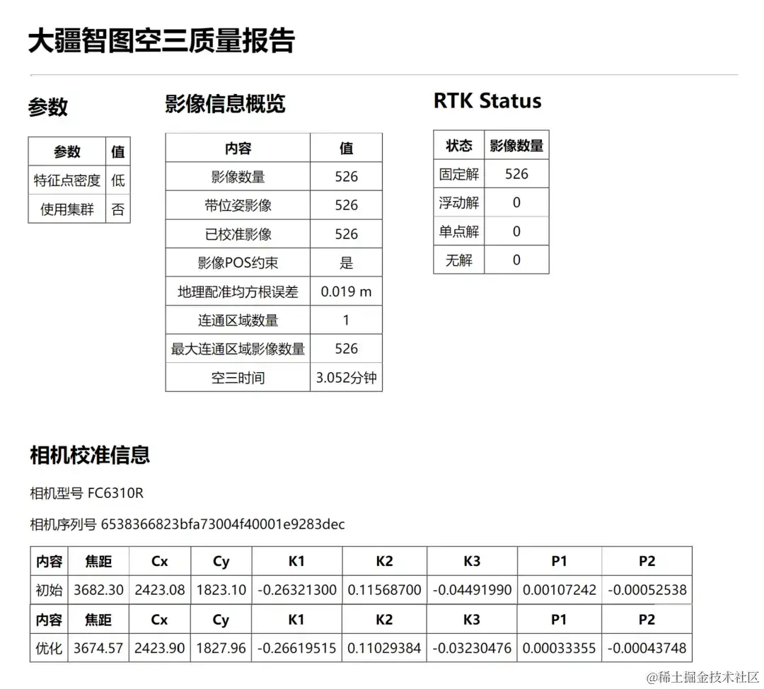 模型重建完成后,可点击【质量报告】查看整体情况,可从报告中查看模型重建各项参数设置信息。需要注意的是,三维模型包括空三和MVS两大步骤,如果要统计三维建模的时间,需要把空三和MVS时间相加。