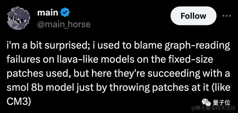 这种架构模式也引起了不少网友的关注,有人就表示,之前总觉得大模型图像理解能力差是因为使用了固定大小的patch。