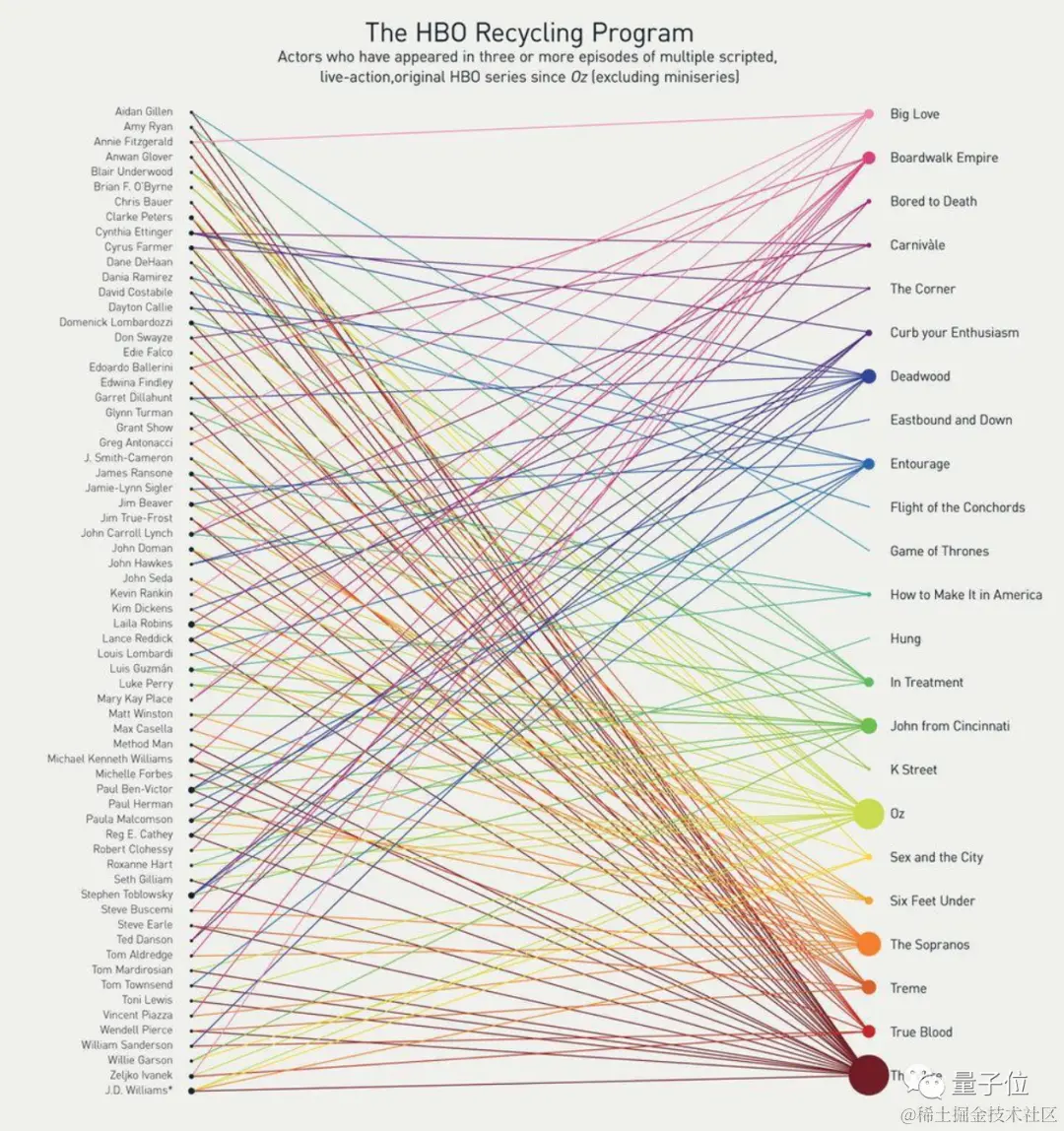 也能从密密麻麻的连线图里找到,权游“小指头”扮演者Aidan Gillen出演过HBO两个系列的剧。