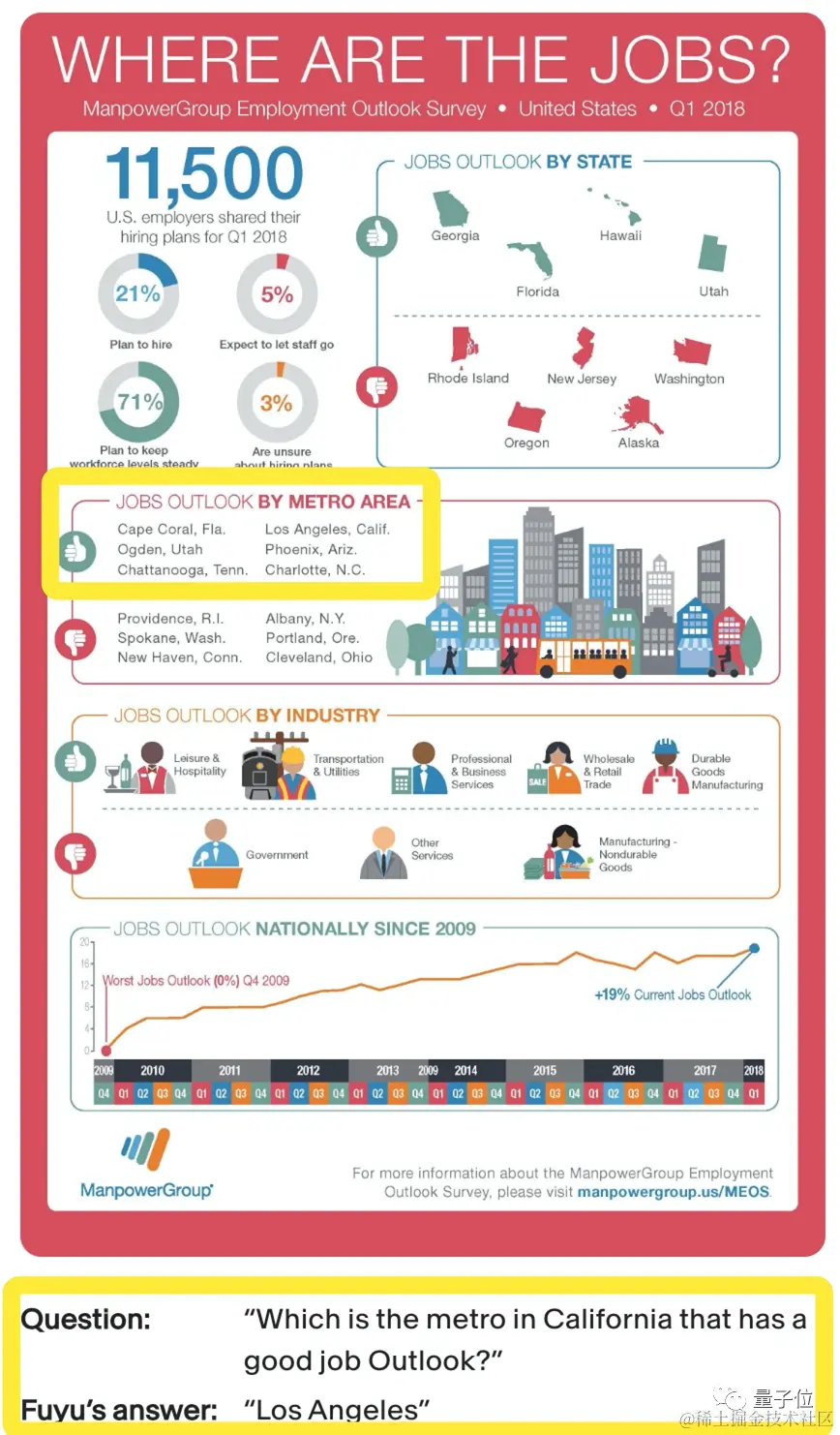 一张包含多个图表的PDF也难不倒它。提问:加州哪里的工作前景不错?