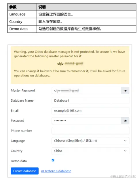 如果初始化Odoo时您没有更改数据库主密码,可选择重新设置一个便于记忆的主密码。创建、删除、销毁或恢复数据库都需要主密码,请务必妥善保管主密码。