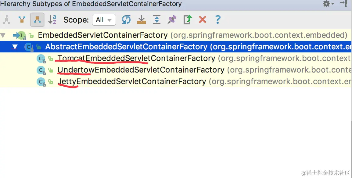 3)SpringServletContainerInitializer将@HandlesTypes(WebApplicationInitializer.class)标注的所有这个类型的类都传入到onStartup方法的Set>;为这些WebApplicationInitializer类型的类创建实例;而WebApplicationInitializer的实现类如下图所示: