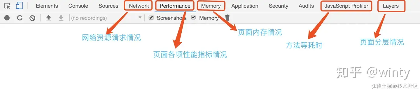 上图是 Chrome Dev Tools 的一个截图,其中,我认为能用于进行页面性能快速分析的主要是图中圈出来的几个模块功能,这里简单介绍一下: