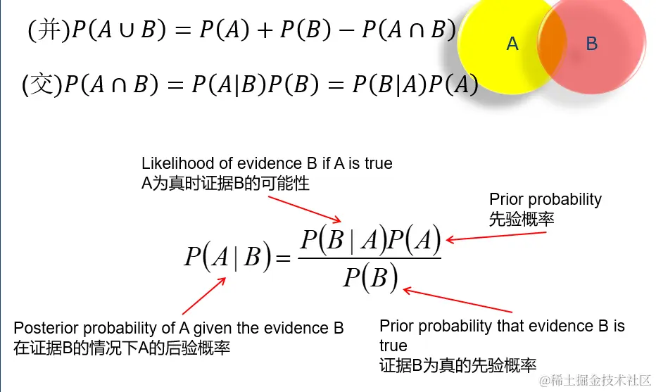 其中,A和B是两个事件,P(A)和P(B)分别表示事件A和B的边缘概率(先验概率),P(B|A)表示在事件A发生的条件下事件B的条件概率,P(A|B)表示在事件B发生的条件下事件A的后验概率。