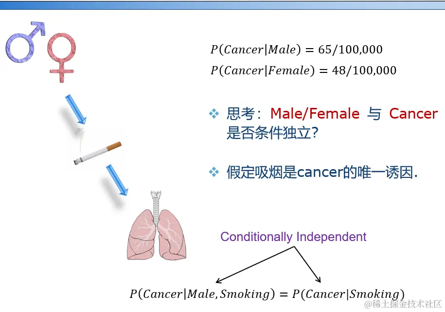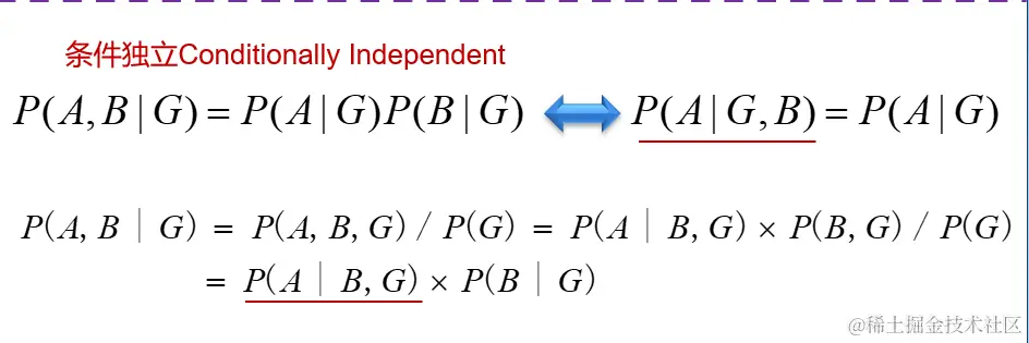 条件独立:条件独立是指在已知某些信息的情况下,**两个事件之间没有因果或关联关系。**具体地说,如果事件 A 和事件 B 在给定事件 C 的条件下是独立的,则称 A 和 B 在条件 C 下是条件独立的。条件独立通常可以表示为: