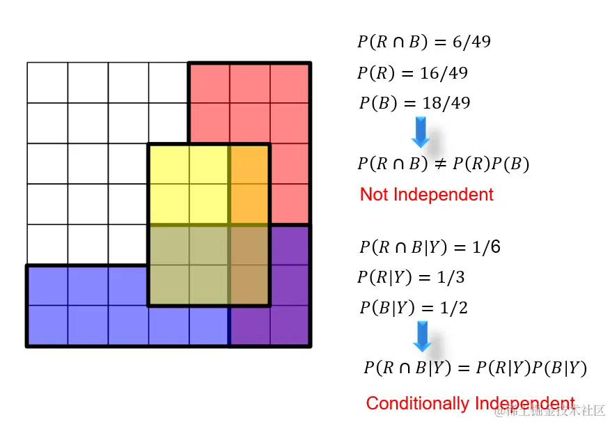 其中,P(A and B | C) 表示在已知事件 C 的条件下,事件 A 和 B 同时发生的概率,P(A | C) 和 P(B | C) 分别表示在已知事件 C 的条件下,事件 A 和 B 发生的概率。