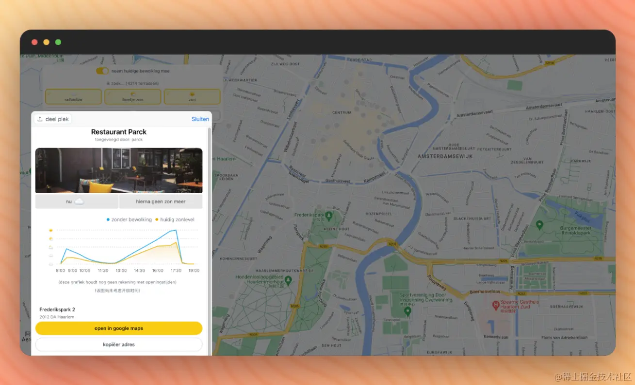 这个网站也很有意思,可以看到阿姆斯特丹的哪个咖啡厅可以晒到太阳,还可以看到可以看到太阳的时间点,还考虑到了天气的情况,很有趣的一个项目。开发者:paul, july, rob