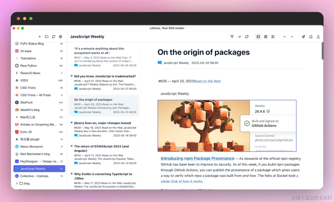 这是一个开源的 RSS 阅读器。作者是杭州的开发者 @zhanglun,项目基于 Tauri 开发,免费,适用 macOS 和 Windows 操作系统。