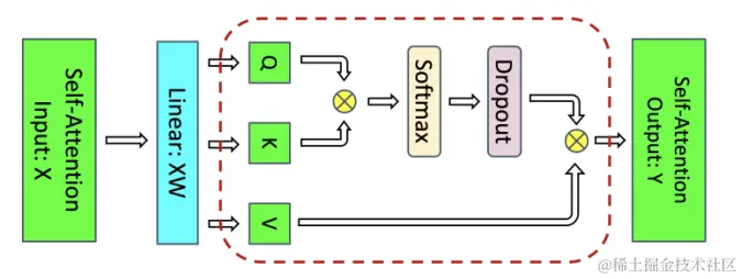 Self-attention中的softmax和dropout算子计算结果占用内存大,但计算量相对少,不保留正向计算结果到反向,在反向计算流程可以重新计算softmax和dropout的结果。