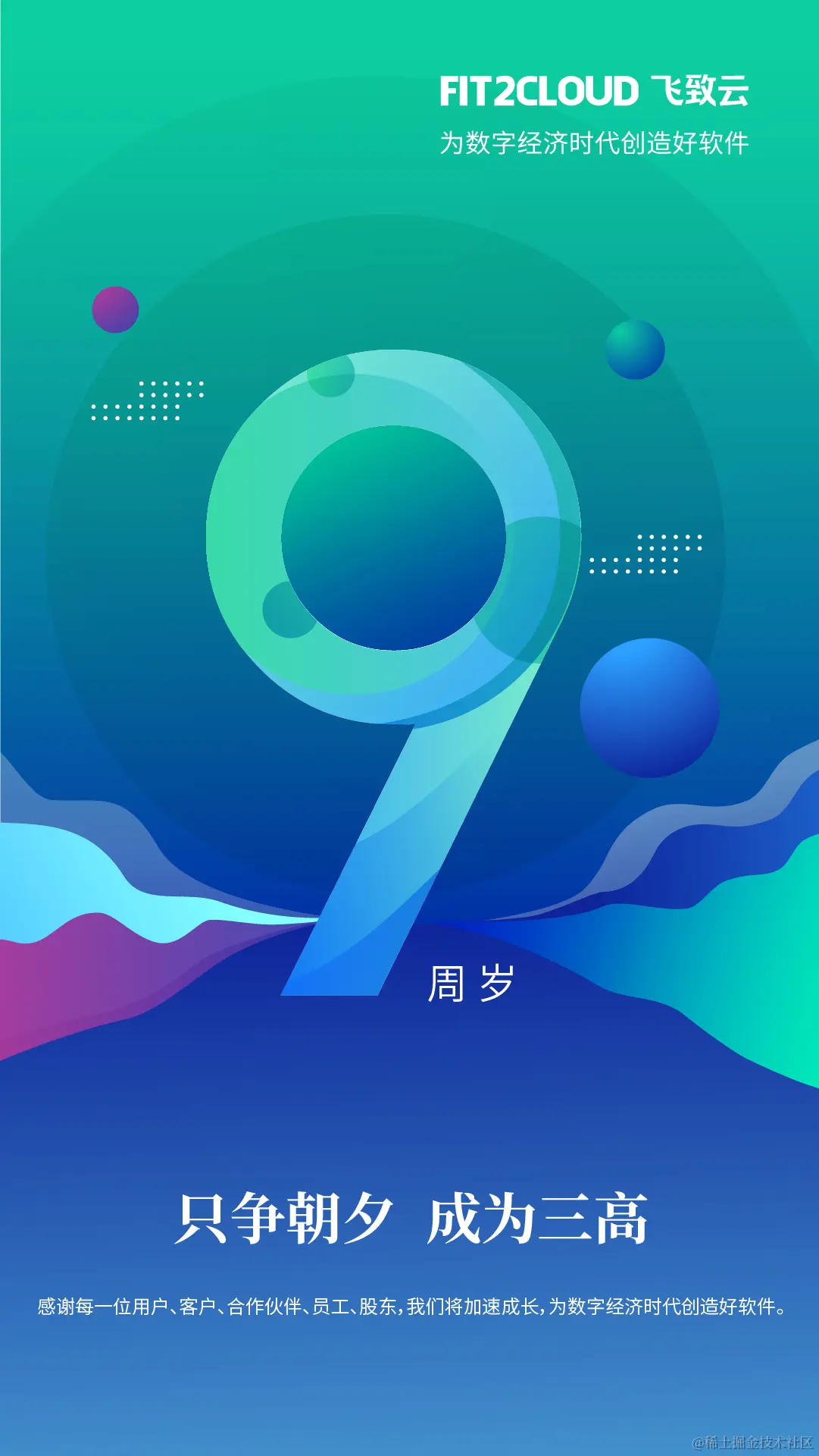 FIT2CLOUD飞致云九岁啦! FIT2CLOUD飞致云 2023-10-23 30 阅读1分钟 只争朝夕,成为三高。 感谢每一位用户、客户、合作伙伴、员工、股东,我们将加速成长,为数字经济时代创造好软件。