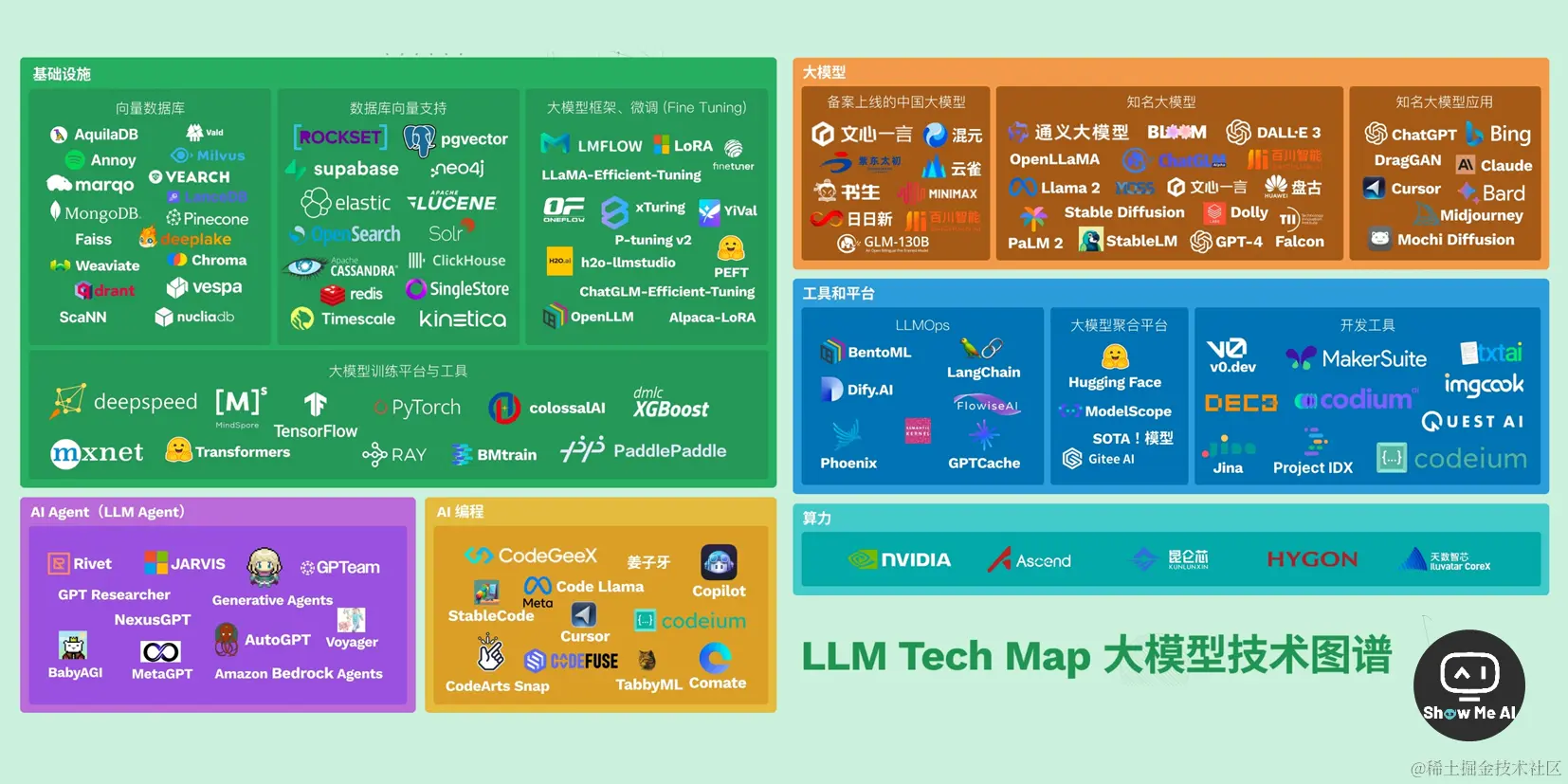 这份图谱将大模型 (LLM) 相关技术进行了分类和可视化,可以帮助大家了解 LLM 的核心技术和关键方向,以及各部分需要了解的关键产品或项目。