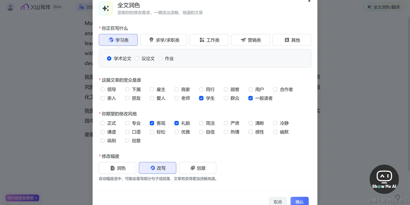 火山写作是字节跳动推出的一款智能写作助手。在页面输入文本后,点击右上角「全文润色/翻译」按钮,就可以在丰富的选项中定制自己的需求。