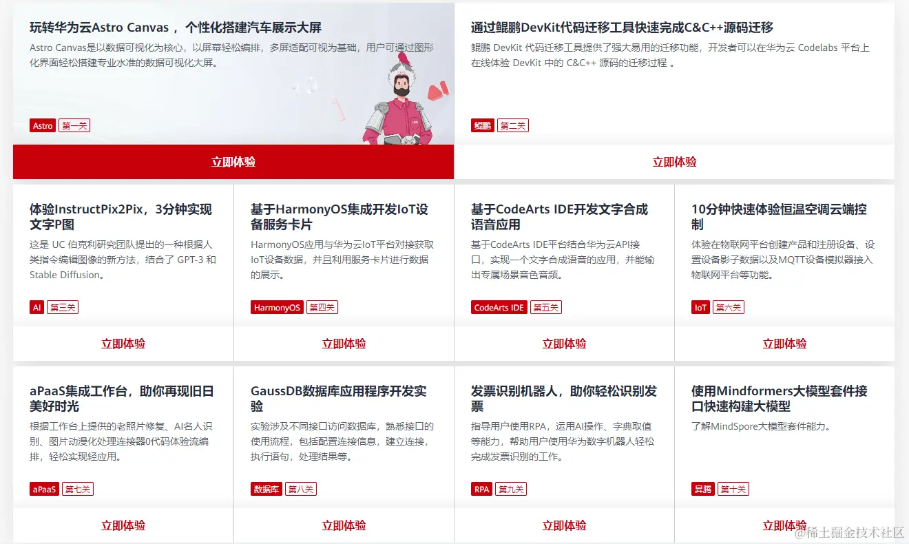 同时,也可以体验鸿蒙、鲲鹏、昇腾等生态的开放能力,比如基于HarmonyOS集成开发IoT设备服务卡片;通过鲲鹏DevKit代码迁移工具快速完成C&C++源码迁移;使用Mindformers大模型套件接口快速构建大模型并进行训练、推理部署等等。