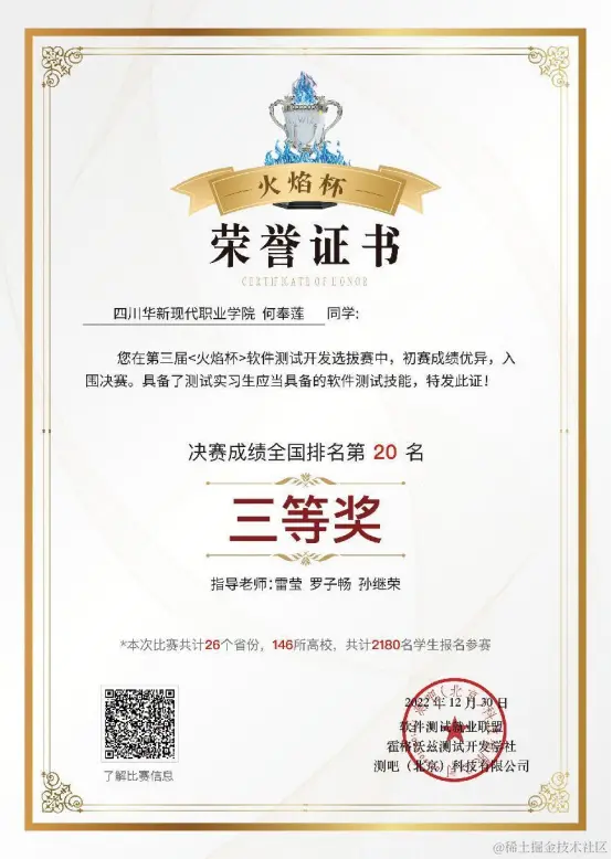 近期,华新学院信工学院在全国大学生“火焰杯”软件测试高校就业选拔赛中取得了杰出的成绩。