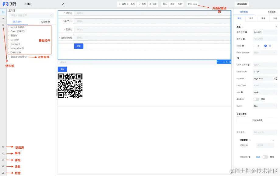 便于用户操作,飞码将组件与模板相关能力放在搭建平台的左上角,具有共享属性(数据源、事件、弹框、函数、数据)的部分配置放在页面的左下角。根据业务线不同,业务组件放在基础组件下方。在页面的顶部区域设计有FMHelper能力,可对页面配置内容做监测。详见图1所示。