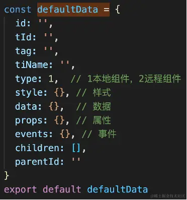 设计LowCode或NoCode,需要先设计相关的DSL。DSL设计是需要满足字段少、可扩展、无异议等性质。根据部门内部技术栈使用与积累情况,飞码使用vue技术栈进行设计与开发。对比vue中接口VNode与VNodeData数据结构,结合需要满足2个大能力点以及对应16个细化点。可以推导出飞码组件父级数据结构defaultData如下图2所示: