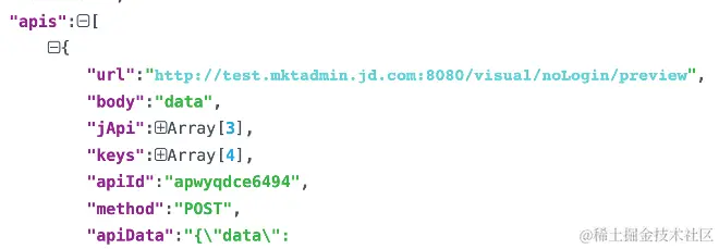 数据源:前端视角认为数据源等同于接口(API),接口是否被调用是通过事件触发的或者在页面生命周期函数中被执行的。可以认为事件触发请求接口,接口返回数据,页面缓存接口返回数据。考虑到复用性于是数据源用一个数组描述,详见图4,其中apis为图3中apis字段。考虑到id的易读性,apiId开头使用ap描述。