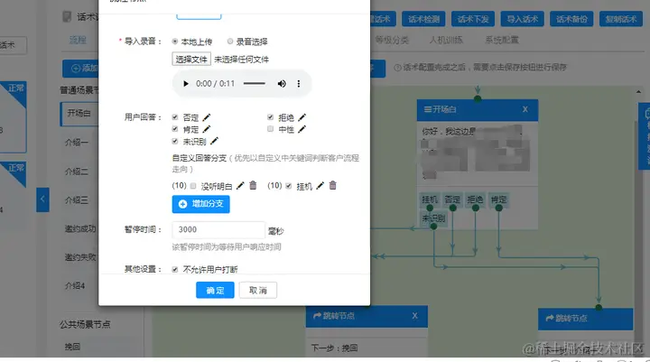- 可以在右下角节点库拖动话术节点编辑话术。节点库:话术节点。跳转节点。转接坐席。按键导航。