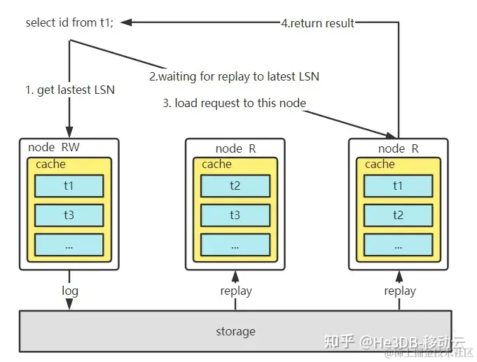 (3)He3DB读节点内存分层设计决定了只读节点不对等,查询请求需要负载到对应有数据缓存的节点,因此He3Proxy不需要等待所有节点都完成回放,只要等待查询中涉及关键表的缓存节点完成回放即可;
