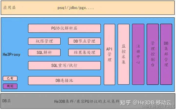 当然自研也不代表我们要从零开始造轮子,由于人力、时间等因素限制,基础功能部分想借助已有开源软件来补充;He3DB是基于PostgreSQL改造开发而来,并且我们期望用户能像使用单机一样使用云原生数据库,因此中间件选择以服务端代理的方式提供,在技术选型时调研了PG生态常用的服务端代理模式的中间件工具,如下图所示:
