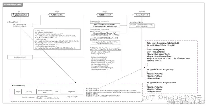 - XLOGShmemInit:负责xlog buffer的初始化。全局变量ControlFile用于缓存confile文件内容。全局变量XLogCtl是xlog buffer的管理结构,包含对buffer索引、自旋锁、buffer空间等的管理。其中LogwrtRqst表示目前xlog 请求的write和flush位置,RedoRecPtr已经完成的xlog write和flush的位置。