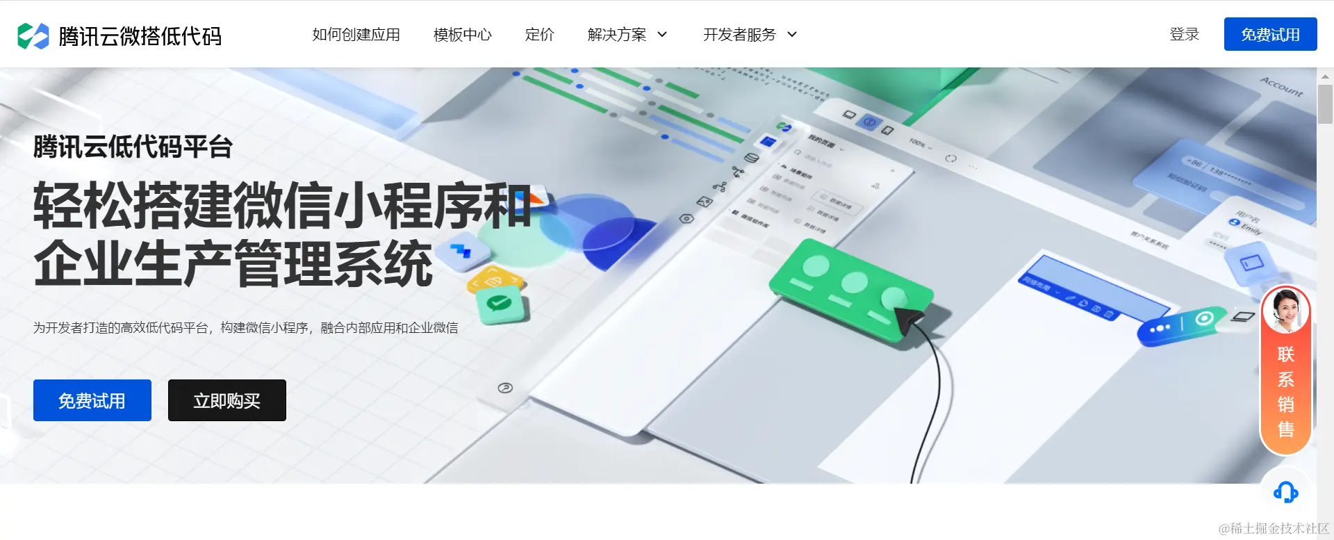 低代码开发平台,由腾讯云计算研发,产品发布于2021年3月。腾讯云微搭,以云开发作为底层支撑,通过行业化模板、拖拽式组件和可视化配置快速构建多端应用(小程序、H5 、PC Web 应用等),免去了代码编写工作,基于腾讯的生态链,它可以集成企业微信、链接腾讯SaaS生态、快速搭建小程序。