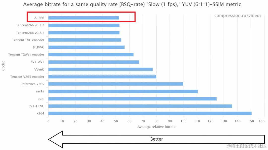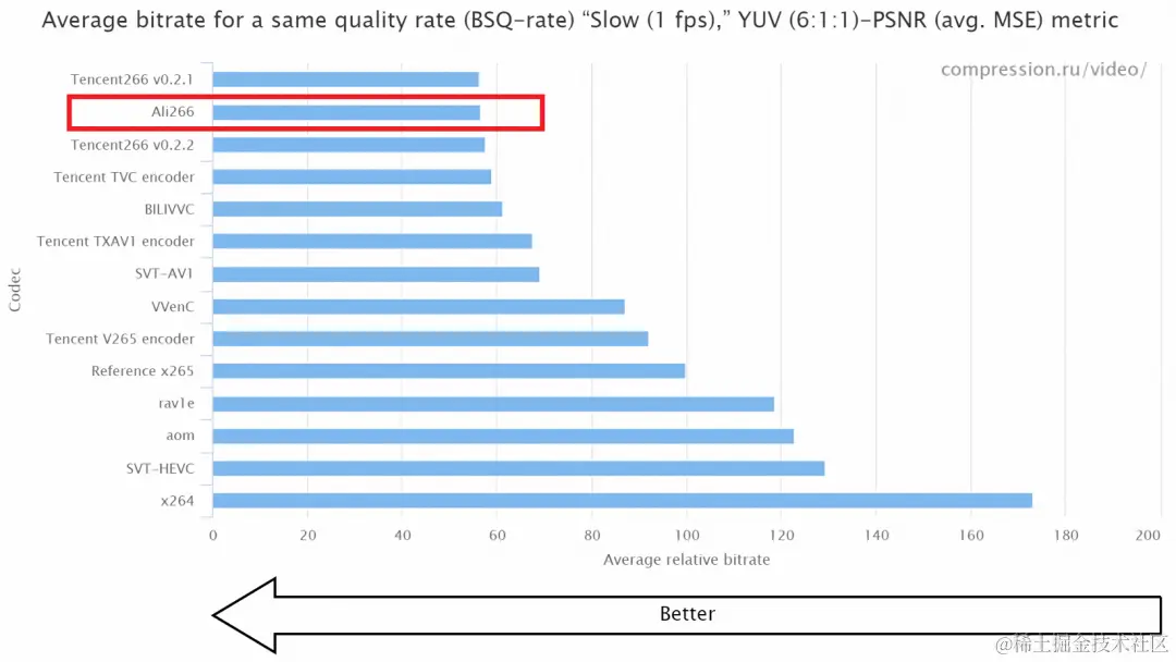 上图中,纵坐标为参赛编码器,横坐标为相同的SSIM质量下,各编码器输出文件相对于参考编码器x265的平均大小。