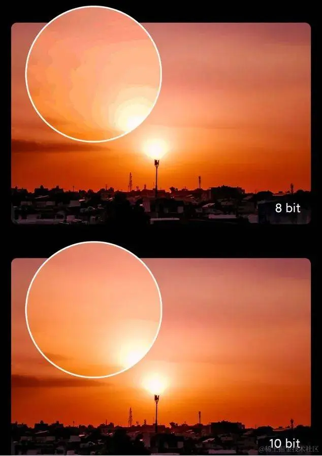 如下表示的夕阳西下图,上半副图采用8bit位深表示,我们看到太阳由内到外的橘黄色过渡存在明显的“断层”现象,而下半副图采用10bit表示,色彩过渡非常自然。