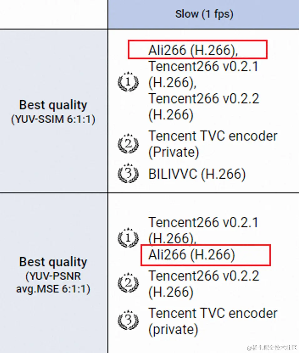 本届MSU大赛共有21款编码器参赛,并首次专门设立了10bit赛道。继获得16届全高清赛道8项冠军和主观赛道冠军后,Ali266参加了本届大赛10bit赛道压缩率最高的1fps速度档位,取得SSIM、PSNR两项指标第一。