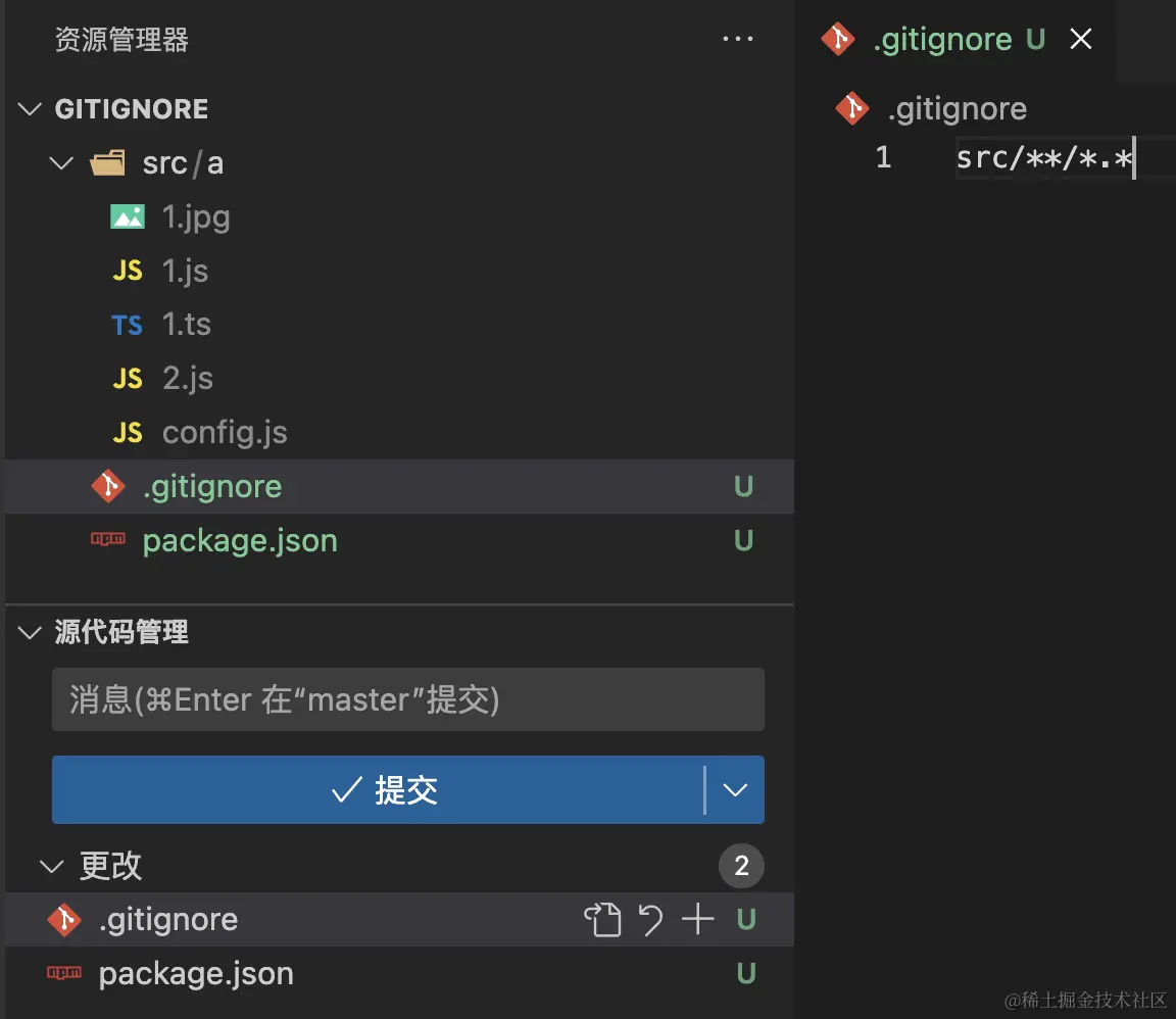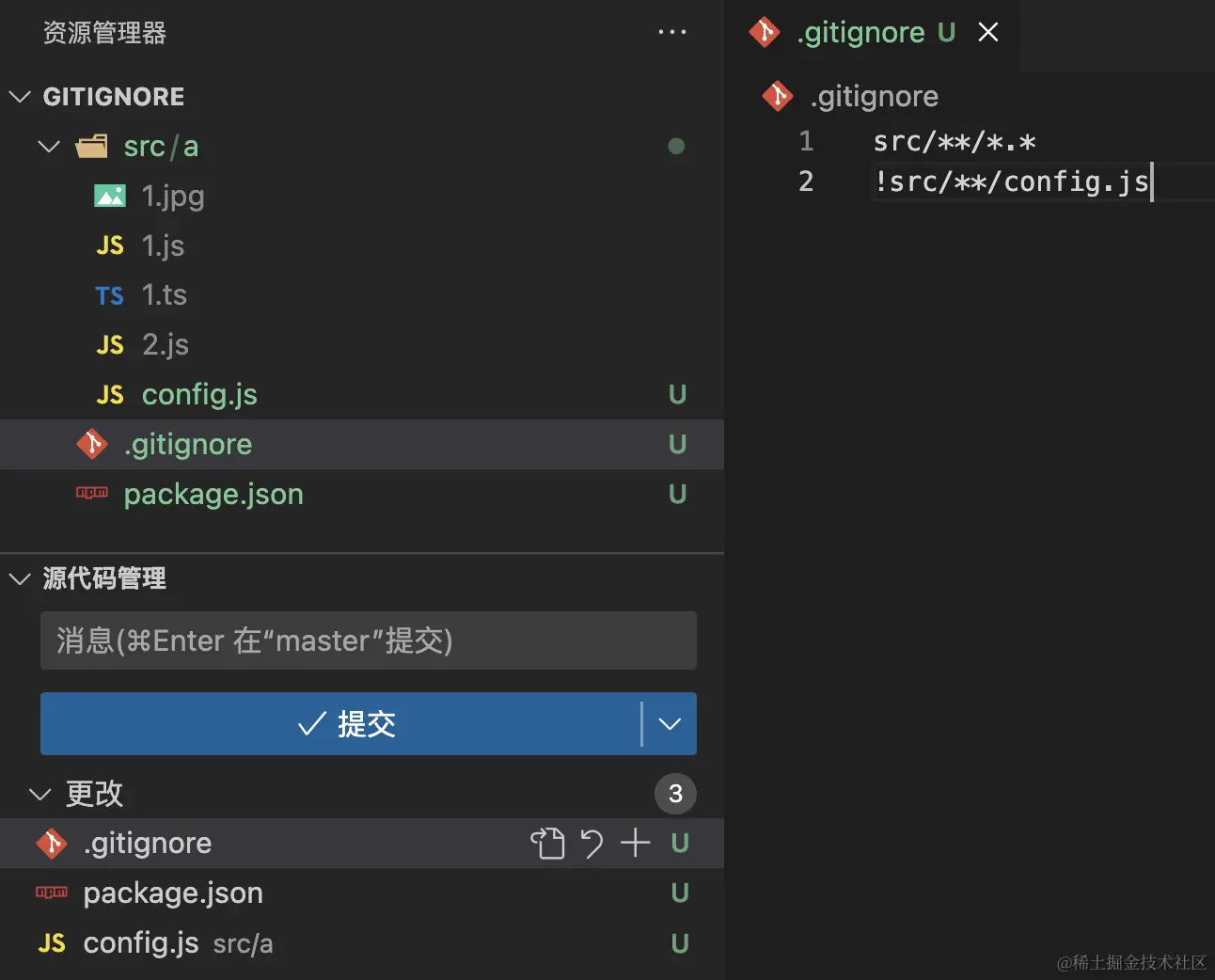 当我们有个文件夹里面,基本上所有的文件都要让它被忽略时候。只有某个文件需要提交时候。例如 这里我把a文件夹下所有的都忽略啦,但是a文件夹下面的文件夹除啦config.js我需要提交。那怎么办呢
