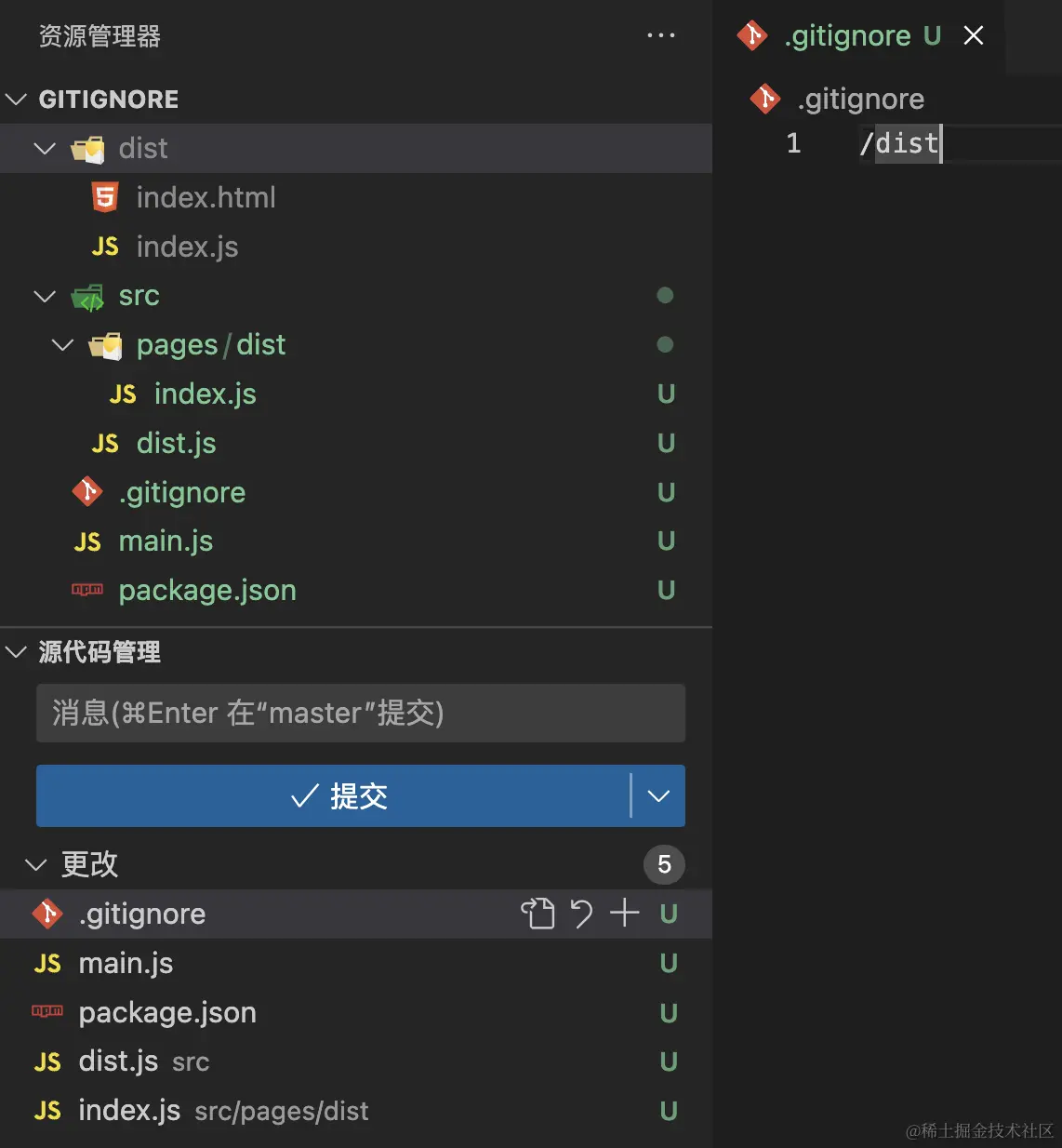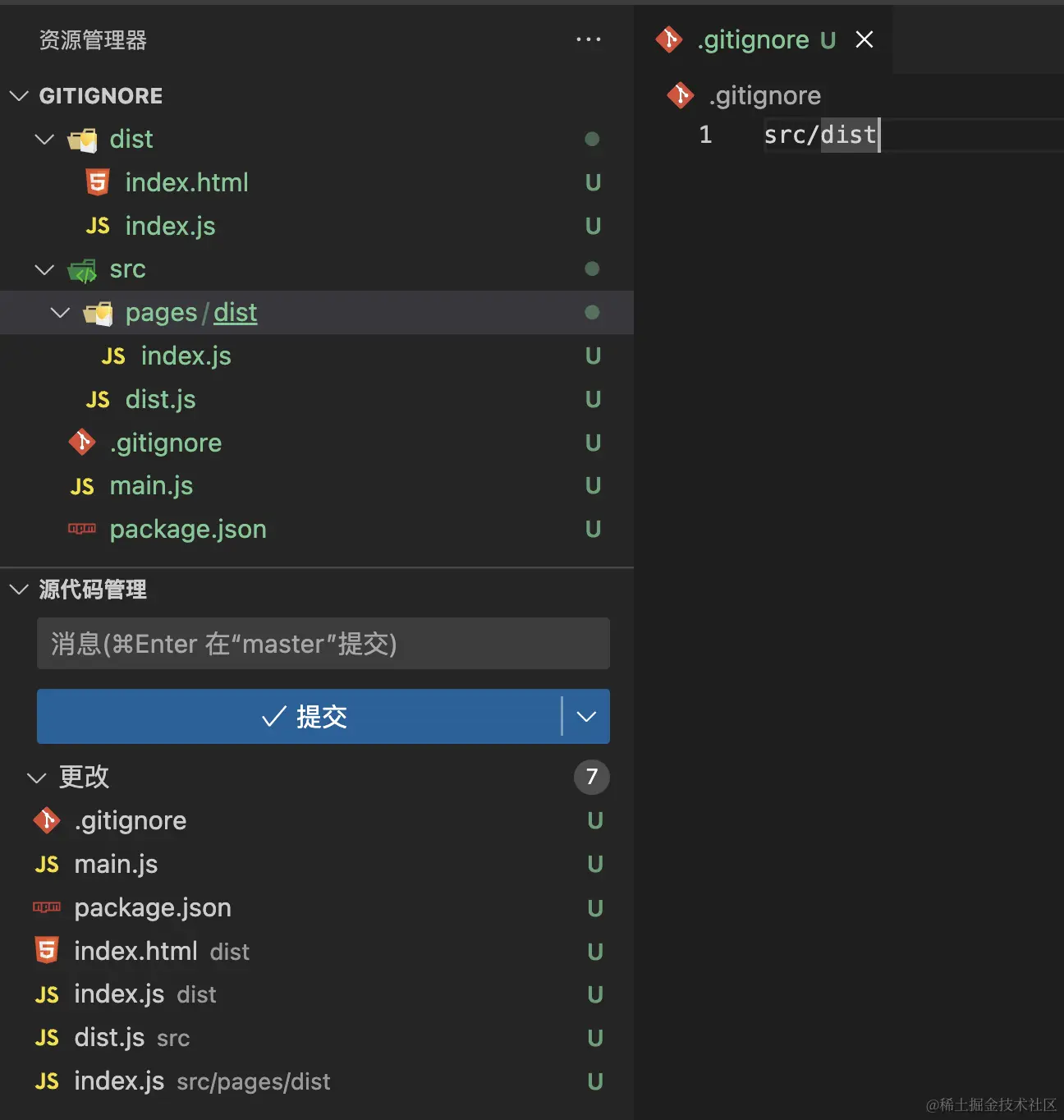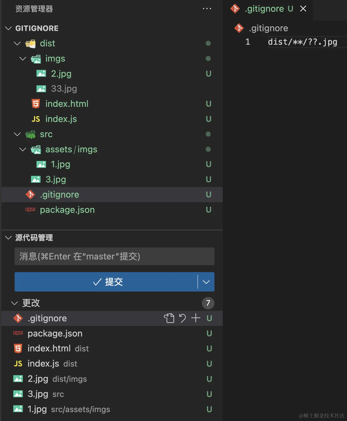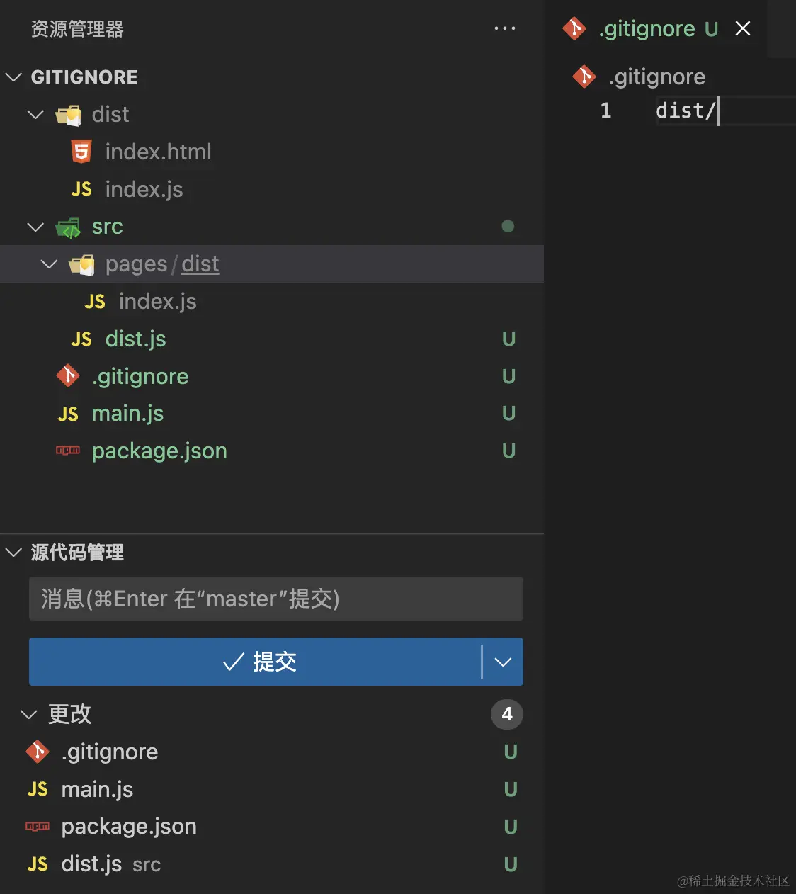 当直接写匹配的名称时,它会匹配当前.gitignore所在项目、文件夹下所有的dist文件夹或文件 可以发现,不管是文件还是文件夹都会被匹配,而且不只是第一层文件夹,文件夹下的文件夹/文件都可以匹配到。