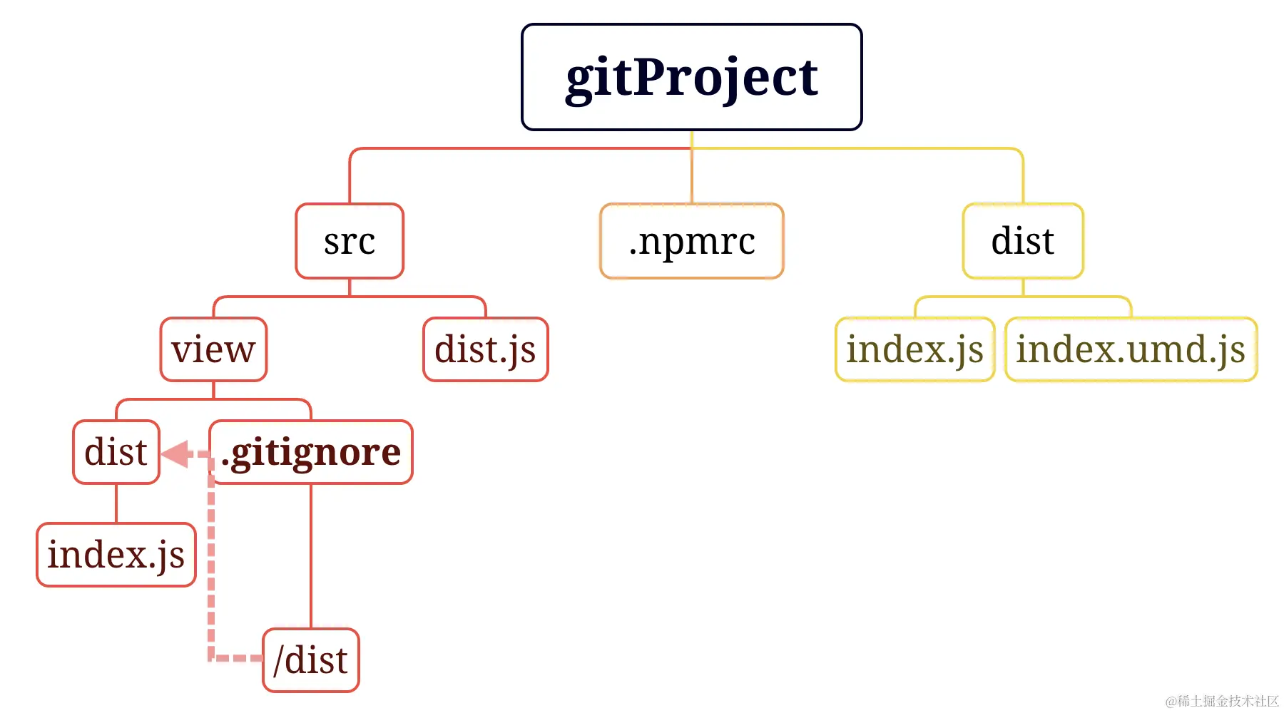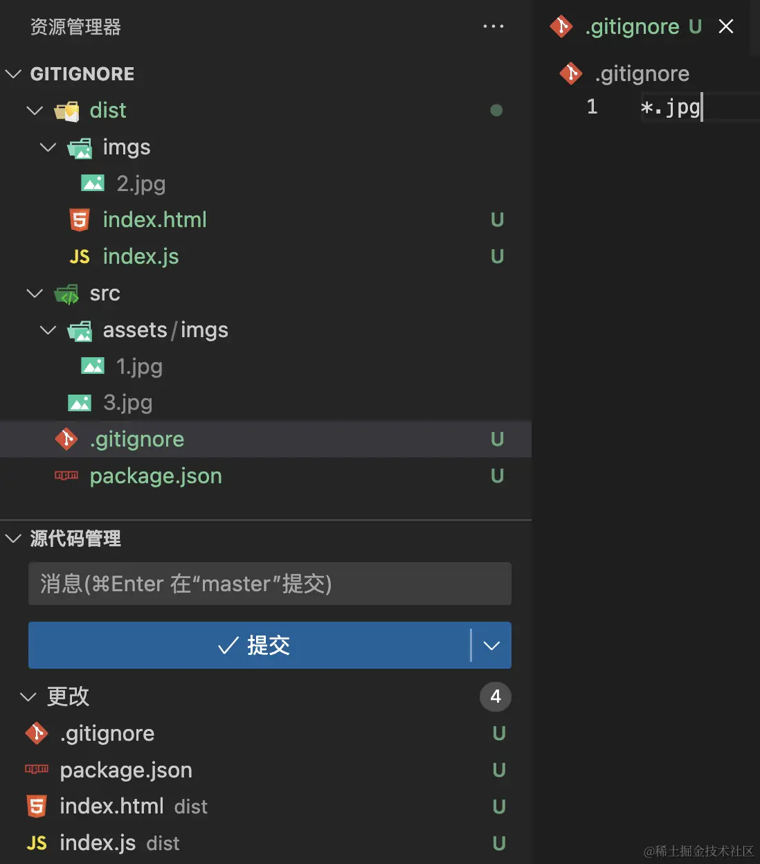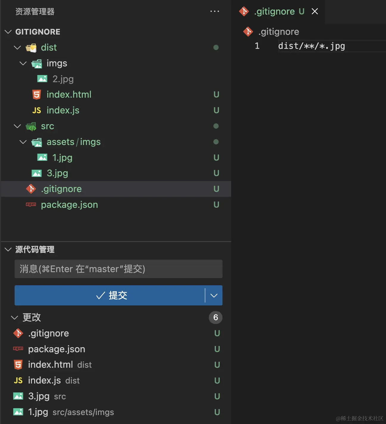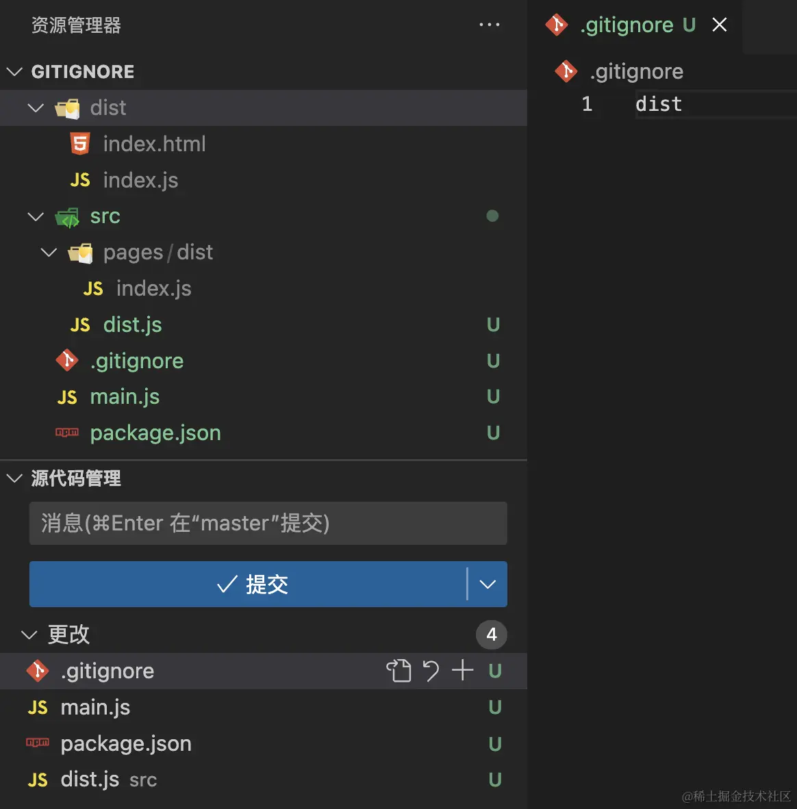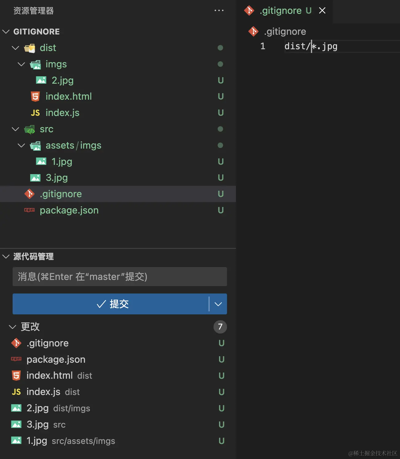 当直接写匹配的名称时,它会匹配当前.gitignore所在项目、文件夹下所有的dist文件夹或文件 可以发现,不管是文件还是文件夹都会被匹配,而且不只是第一层文件夹,文件夹下的文件夹/文件都可以匹配到。