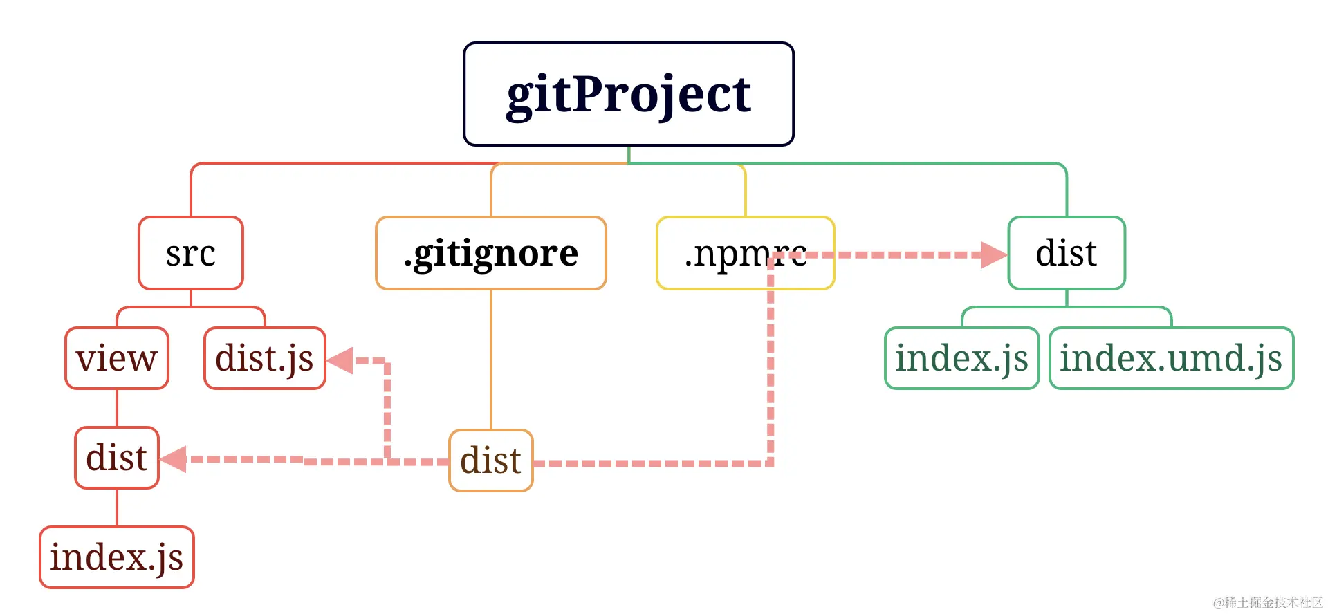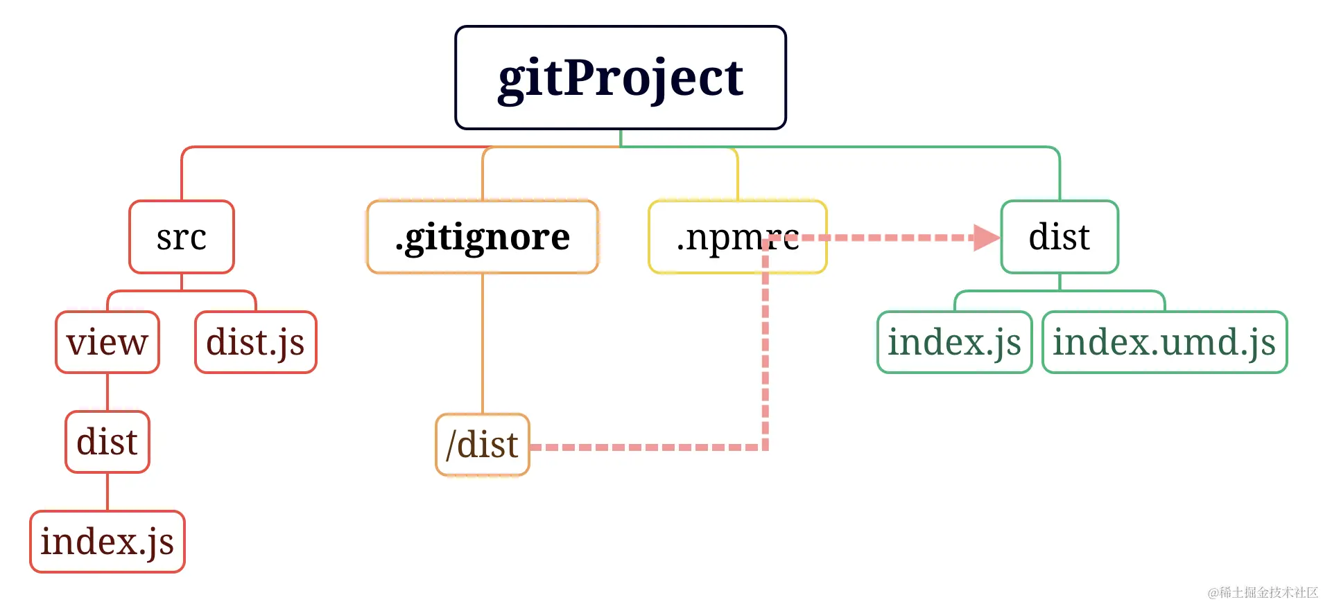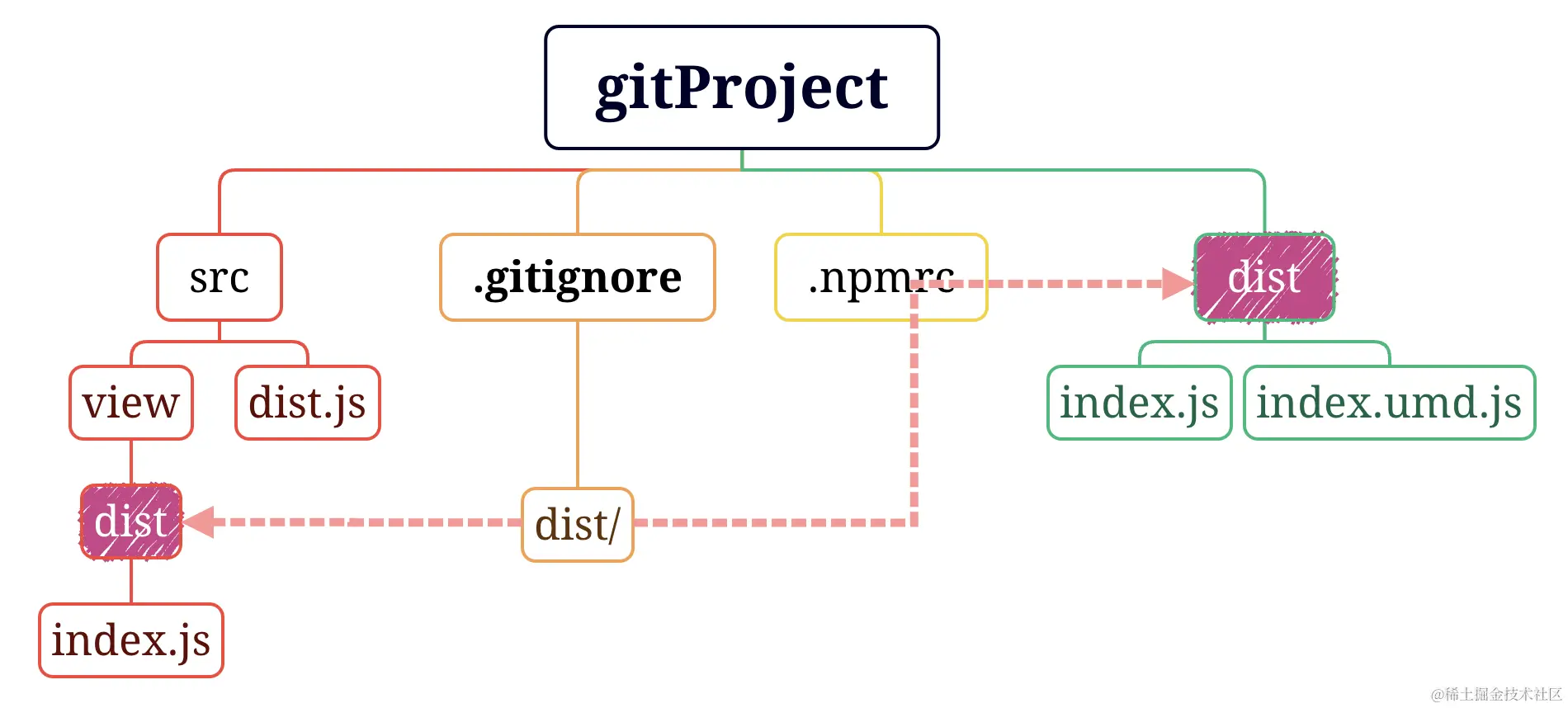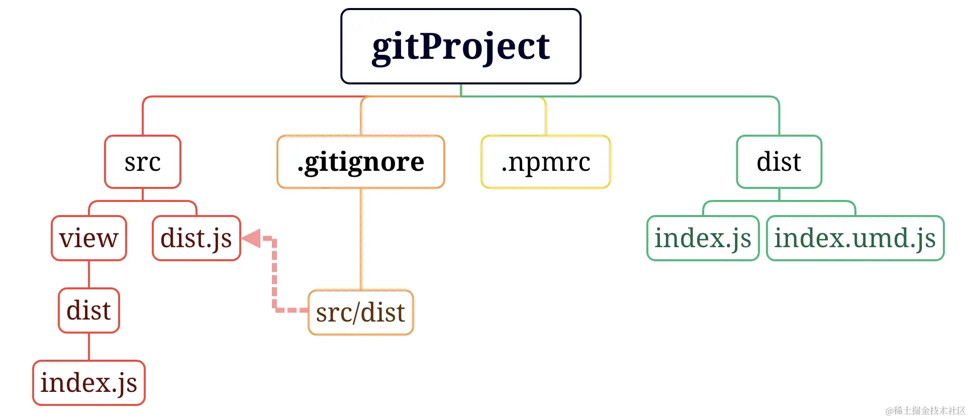 当直接写匹配的名称时,它会匹配当前.gitignore所在项目、文件夹下所有的dist文件夹或文件 可以发现,不管是文件还是文件夹都会被匹配,而且不只是第一层文件夹,文件夹下的文件夹/文件都可以匹配到。