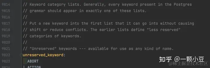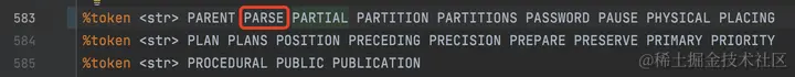 词法分析器可以通过以上定义识别关键字,由于新定义的关键字仍可以用于其他标识符中,因此我们还需要将PARSE添加到unreserved_keyword中,sql.y文件中搜索 "unreserved_keyword:" ,并将PARSE添加进去。