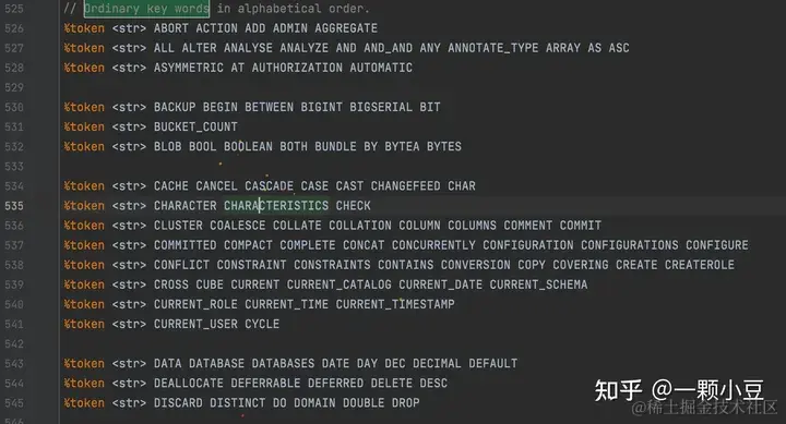 打开pkg/sql/parser/sql.y文件,搜索 “Ordinary key words”,会看到按照字母排序的一系列关键字定义,由于SQL关键字已经被定义,所以我们只需添加关键字 PARSE